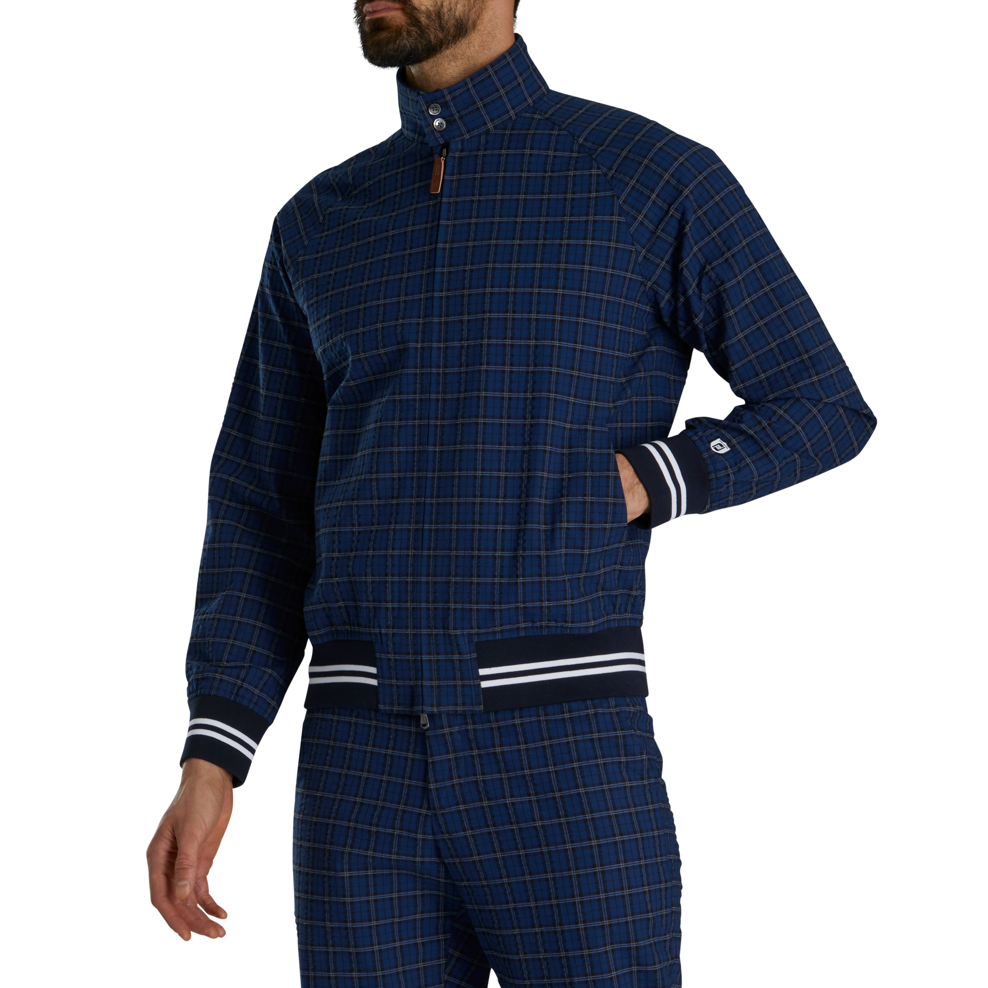 Here, the classic windbreaker gets updated in yarn-dyed navy plaid. The stretch cotton fabric is actually a seersucker, but ridges or “wales” on it are so subtle that from far away it passes for flat. Design details include contrast tipping, an olive Bemberg lining and a two-way zipper with a leather pull — there’s also a two-button closure at the neck for those mornings when you’re the first foursome off. This is a great style for the course, the patio of the 19th hole or just running errands around town.